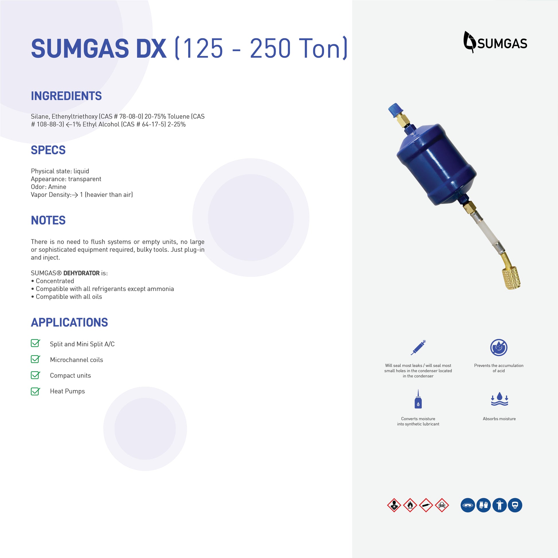 Utilice Deshidratador SUMGAS® para eliminar humedad y prevenir la formación de ácido en su aire acondicionado. La presencia de humedad de los refrigerantes a base de HCFC puede formar ácidos clorhídrico e hidrofluórico extremadamente corrosivos, que corroen químicamente los sistemas y reduce el rendimiento y la eficiencia de los sistemas de aire acondicionado. SUMGAS® PDXL4 neutraliza los ácidos en los sistemas al tomar la humedad y convertirla en un aceite sintético que mejora la lubricación.