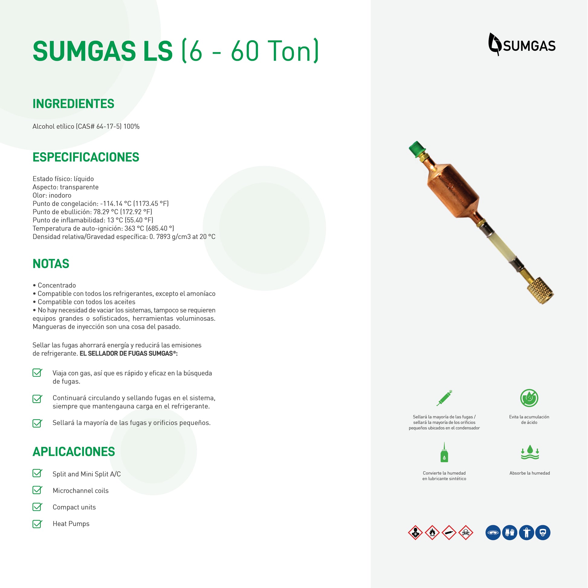 Nuestro Sellador SUMGAS® es compatible con todos los refrigerantes excepto el amoníaco. Este producto se desempeña mejor en bombas de calor, split y mini split, unidades compactas, bobinas de microcanal, refrigeradores, y unidades comerciales. A diferencia de la mayoría de los otros productos en el mercado, Sellador SUMGAS® viaja con el gas, lo que lo hace más rápido y más eficaz para encontrar fugas. Sellador SUMGAS® sellará la mayoría de las fugas cuando se use de acuerdo con las instrucciones del fabricante y sellará la mayoría de los pequeños orificios ubicados en el condensador de A/C, evaporador, accesorios y juegos de líneas metálicas.