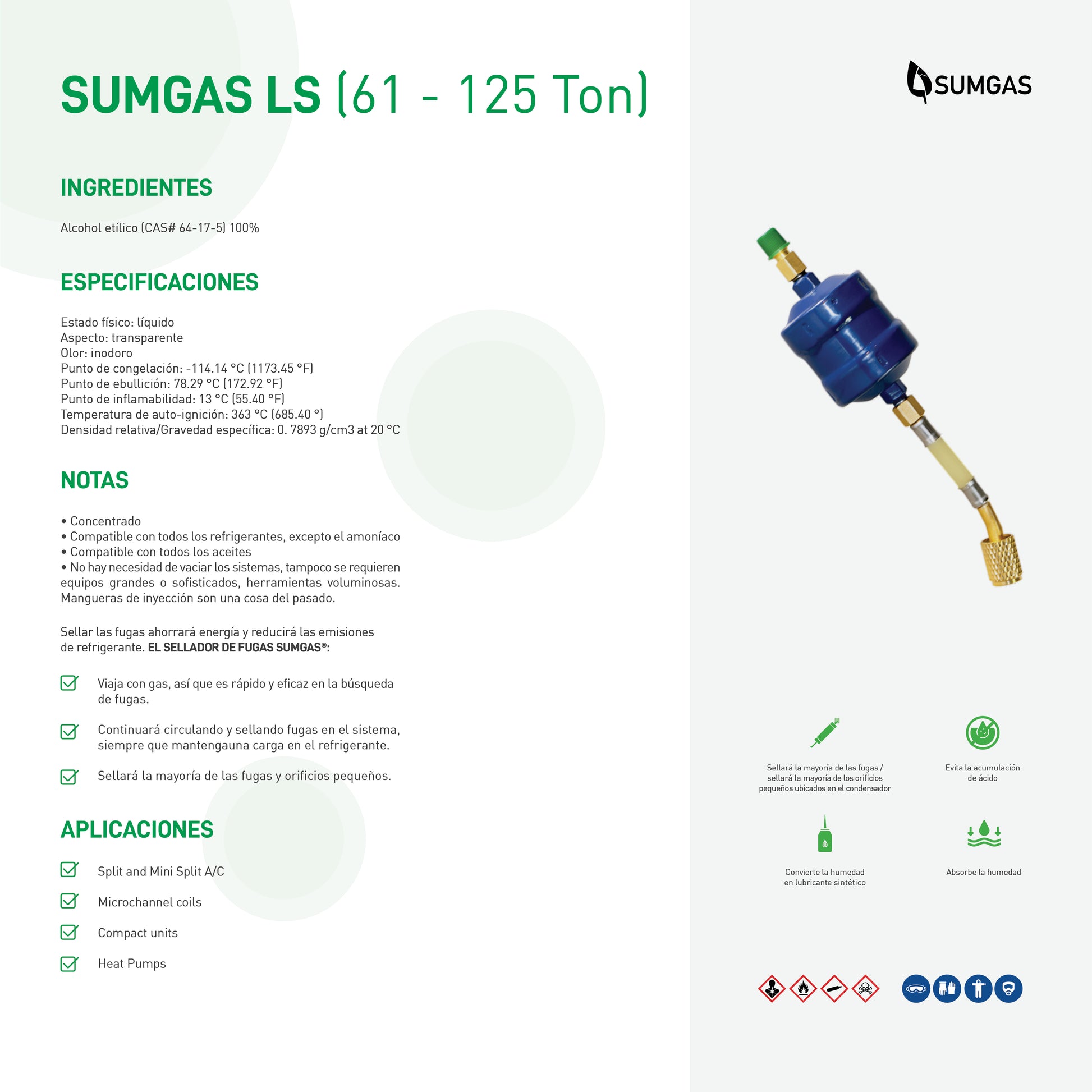 Nuestro Sellador SUMGAS® es compatible con todos los refrigerantes excepto el amoníaco. Este producto se desempeña mejor en bombas de calor, split y mini split, unidades compactas, bobinas de microcanal, refrigeradores, y unidades comerciales. A diferencia de la mayoría de los otros productos en el mercado, Sellador SUMGAS® viaja con el gas, lo que lo hace más rápido y más eficaz para encontrar fugas. Sellador SUMGAS® sellará la mayoría de las fugas cuando se use de acuerdo con las instrucciones del fabricante y sellará la mayoría de los pequeños orificios ubicados en el condensador de A/C, evaporador, accesorios y juegos de líneas metálicas.