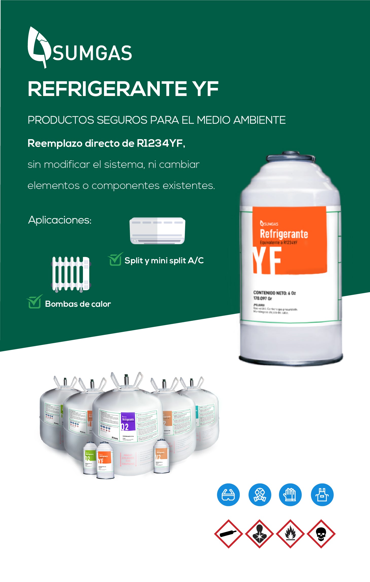 Los refrigerantes SUMGAS® YF son reemplazo directo de R1234YF sin necesidad de hacer modificaciones del sistema, ni de cambiar elementos o componentes existentes. Solo debe sacar el refrigerante actual en el sistema y sustituirlo con SUMGAS® YF. Pueden utilizar cualquier aceite, tanto mineral como sintético. Nuestro refrigerante SUMGAS® YF contiene un aditivo especial anti-fricción que, junto con las características del refrigerante, hace que el compresor trabaje más cómodamente, alargando la vida del mismo. A su vez, logrará evitar las fugas de sistema y que el equipo consuma menos energía, lo que significará ahorros en su factura eléctrica.